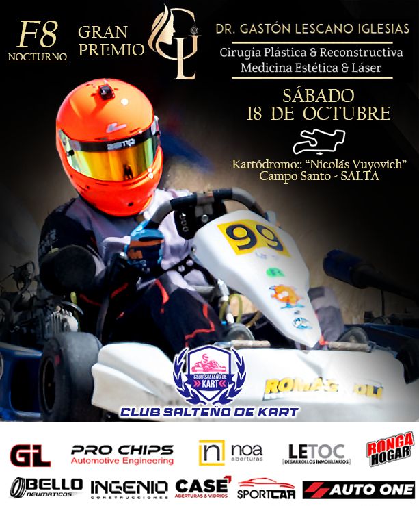 En la continuidad del presente campeonato, el Club Salteño de Kart hará disputar la 8va competencia de la temporada. La fecha especial denominada “Gran Premio: Dr. Gastón Lezcano Iglesias” será con invitados para las categorías 110cc y PRO 150cc, y se completará con las categorías Escuela, Junior y Amigos 390. La misma se correrá en horario nocturno, el sábado 16 de octubre en el trazado “Nicolás Vuyovich”, en la localidad salteña de Campo Santo.